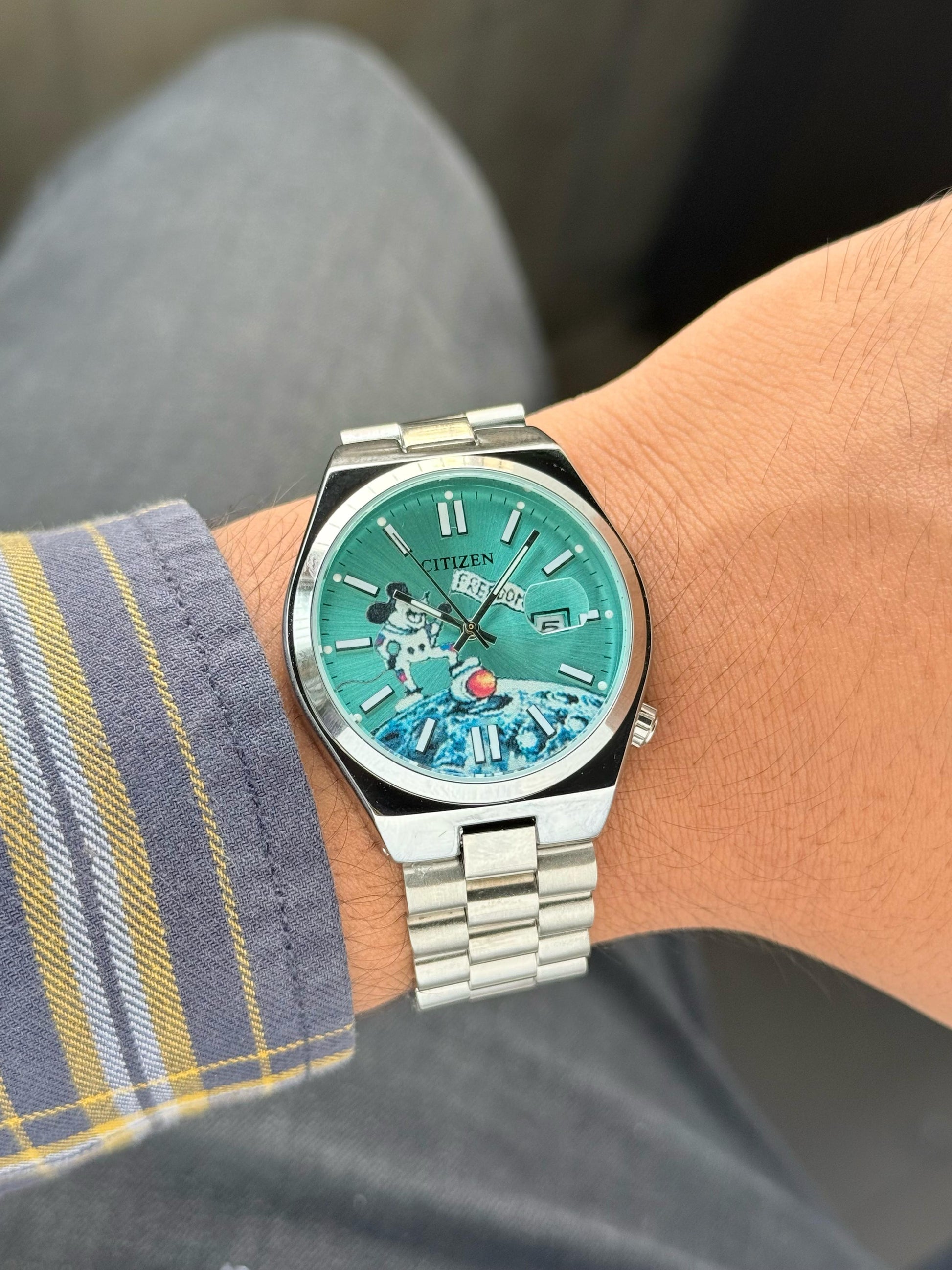 An artistic masterpiece on your wrist, the Citizen Freedom Edition is more than just a watch—it's a statement. Featuring a vibrant turquoise dial with a unique freedom-themed artwork, this timepiece blends creativity with precision.